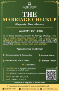 In His Steps Ministries invites married couples to join us for The Marriage Checkup, a special two-day overnight experience designed to help couples pause, reflect, and strengthen their marriage in a Christ-centered environment.